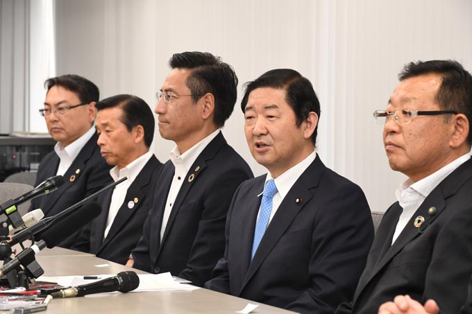 統一地方選の結果を受けて、公明党大阪府本部の佐藤茂樹代表らが開いた会見=2019年5月11日 写真提供:産経新聞社