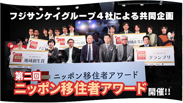 このコンテストは移住先で理想的な暮らしを実現した人たちを表彰するもので、産経新聞社、ニッポン放送、ポニーキャニオン、BSフジの4社が共同で開催し、8自治体8組が選考会に進出しました