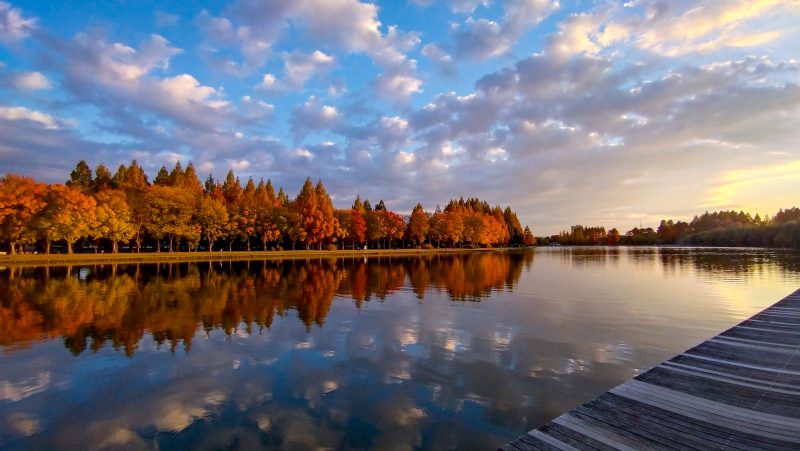 東京都立・水元公園側から、埼玉県営・みさと公園を望む紅葉が、夕陽を浴びて色鮮やかでした。