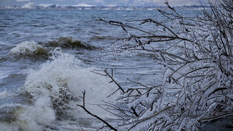 氷は、観光案内に登場するほどには成長しておりませんでしたが、強風で舞い上がった水しぶきがクリスタルのような不思議な造形美を演出しておりました。