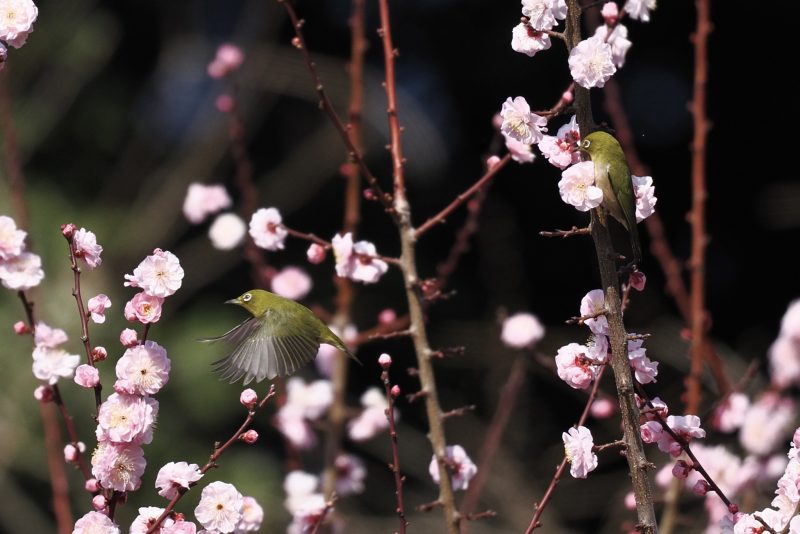 ちょうど見頃になっている梅に群がるメジロを