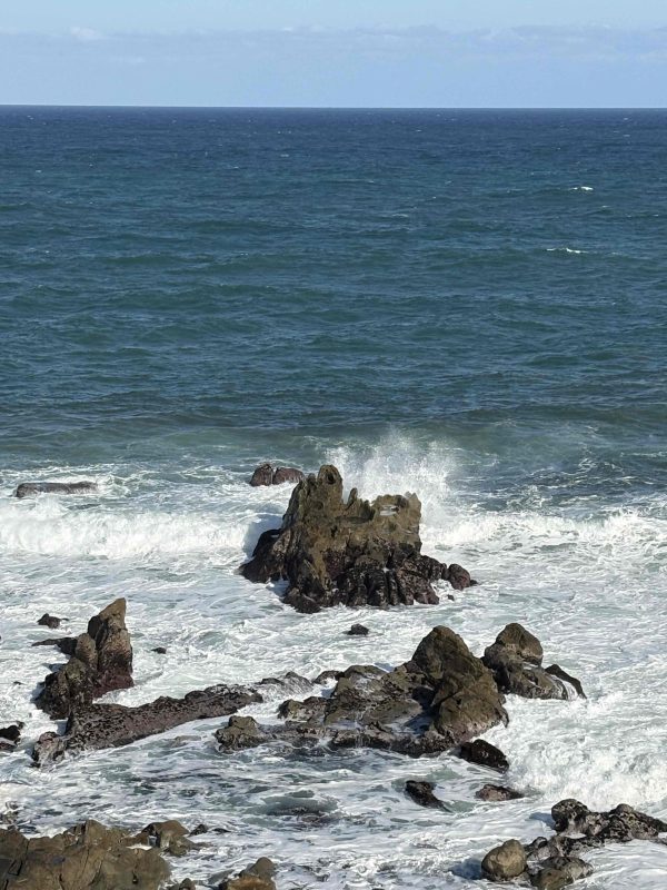 荒ぶる波が岩に打ち寄せる