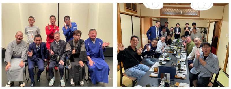 右は打ち上げの模様。手前にテツ&トモ。左に太田、高田、志らく。立っているのは仕切っているように見えるワタナベエンターテインメントの吉田会長(日大ではなく東大)。