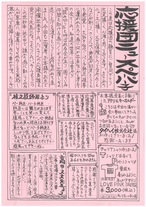 たい平 手作りの「ガンバレ!ペーパー(紙)新聞」 2回開催された応援の会で配られたもの。