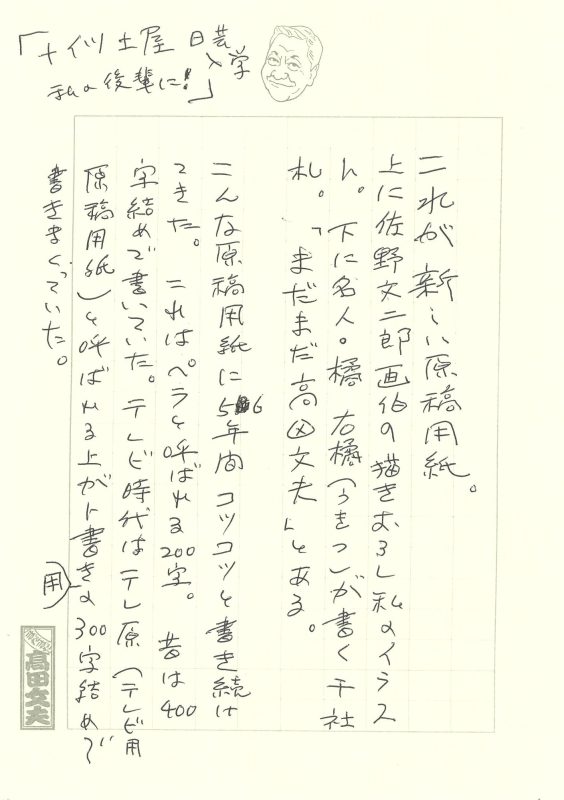 これが新しい原稿用紙。 上に佐野文二郎画伯の描きおろし私のイラスト。下に名人・橘右橘(うきつ)が書く千社札。「まだまだ高田文夫」とある。 こんな原稿用紙に56年間...