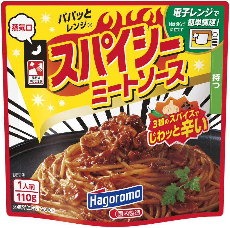 ※『パパッとレンジ スパイシーミートソース』は、今年8月に発売された商品で、黒こしょう、ハラペーニョ、ガーリックの3種のスパイスを使った、じわッと辛く、香りひろがるミートソースです。