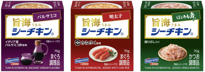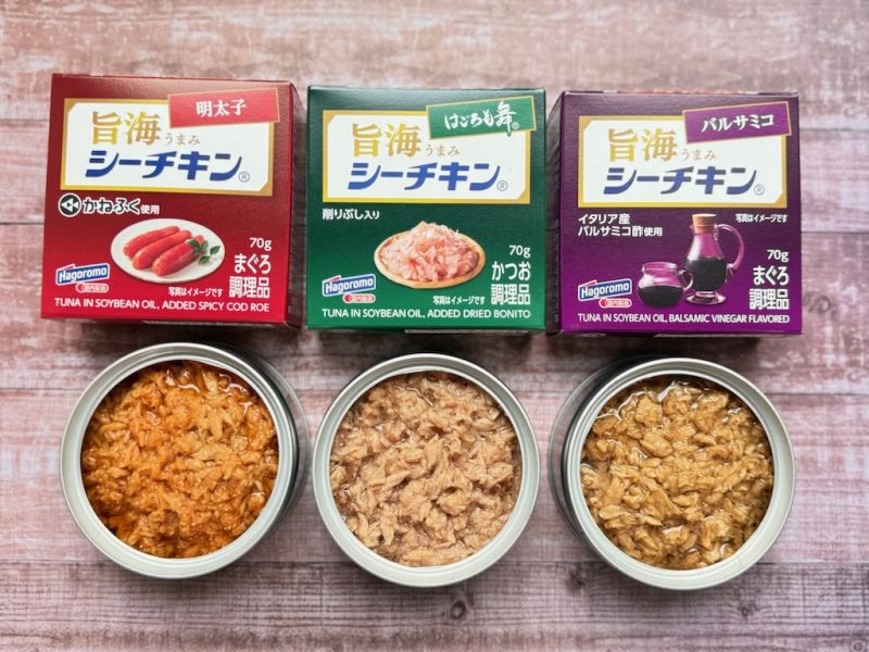 「明太子」「バルサミコ」はまぐろ、「はごろも舞」はかつおと、素材の違いからもこだわりが感じられます。サラダやサンドイッチのトッピングとしてもおすすめです。