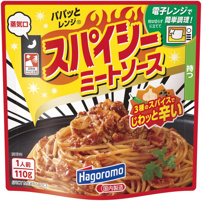 ① 食パン3枚それぞれにマヨネーズを塗り、スパイシーミートソース、千切りキャベツ、スライスチーズの順番にのせる。