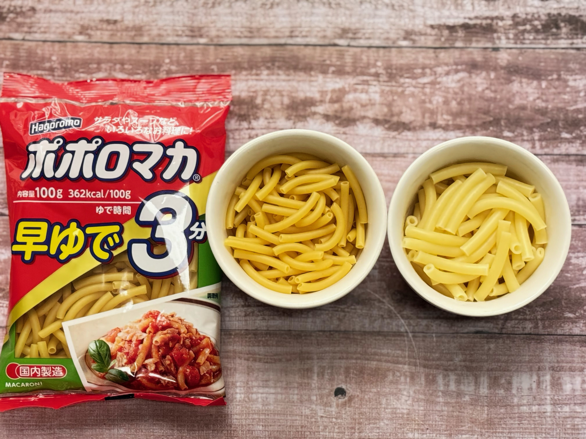 ① ポポロマカ早ゆで3分を表示通りにゆでる。同時にスパイシーミートソースを表示通り電子レンジで温める。