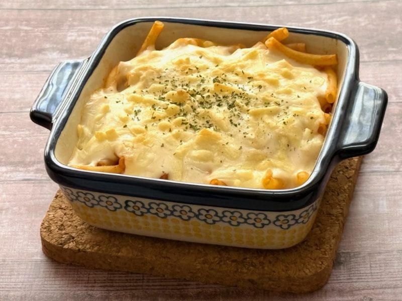 ② グラタン皿に水気を切ったポポロマカとスパイシーミートソースを入れて混ぜ、上にホワイトソース、チーズの順に重ねる。オーブントースターで約5分焼き、お好みでドライパセリをかける。