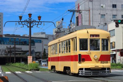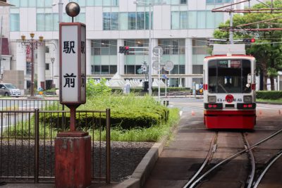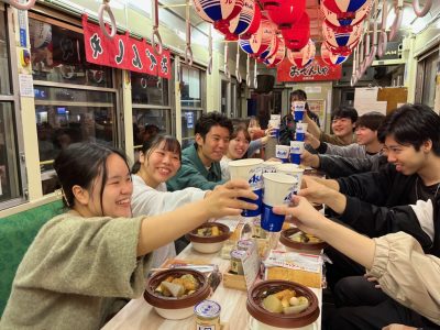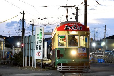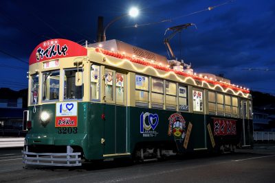 大竹「この電車は貸切電車として運行していまして、車内には提灯やのれんを飾り付け、特別な空間を演出しています。使用している車両も昭和の時代に活躍した路面電車なのです。運行区間は『駅前』から『運動公園前』までの往復約9.4キロ。所要時間は休憩を含めておよそ1時間30分です」