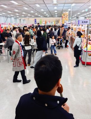 晴の輔 会場はものすごい賑わいです。今、僕はニッポン全国物産展の会場に来ています。サッカーの試合ができるのではないかと思うほど広いスペースに、お店がぎっしり並んでいます。人もぎゅうぎゅう詰めで、若い人から家族連れ、おじいちゃんおばあちゃんまで、本当に幅広い世代が集まっています。