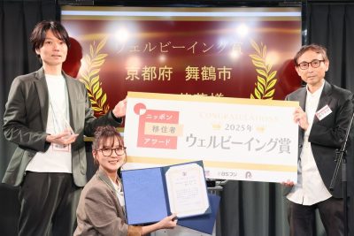 ウェルビーイング賞には、移住の苦悩や楽しさを、コミックエッセイで発信し、充実した人生を送っている姿が、ウェルビーイングを体現していると評価された、京都府舞鶴市の岡山茉莉さんと、舞鶴市 産業振興部 ふるさと応援課の藤村聡さん。