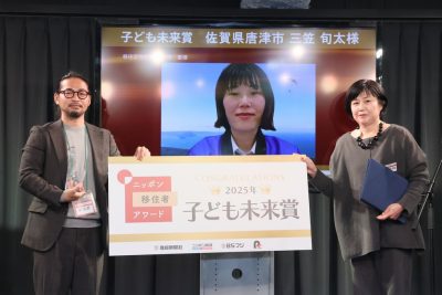 こどもみらい賞には、NPOの運営や、古道具店を営みながら、子どもたちと一緒に森を守り育ていく姿が評価された、佐賀県唐津市の三笠旬太さん、そして、唐津市・地域づくり部 移住定住促進課 移住定住促進係の下田愛さん。
