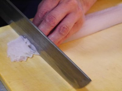 そんな「はも」には、長くて硬い小骨がたくさんあるので、その骨を細かく断ち切る「骨切り」という調理方法が必要です。その「骨切り」が職人技です。職人の腕によって美味しく食べられます。