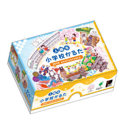 降旗「上越市合併20周年記念に制作した、上越市内の統廃合された小学校を含む、全67校を収録したかるたです」