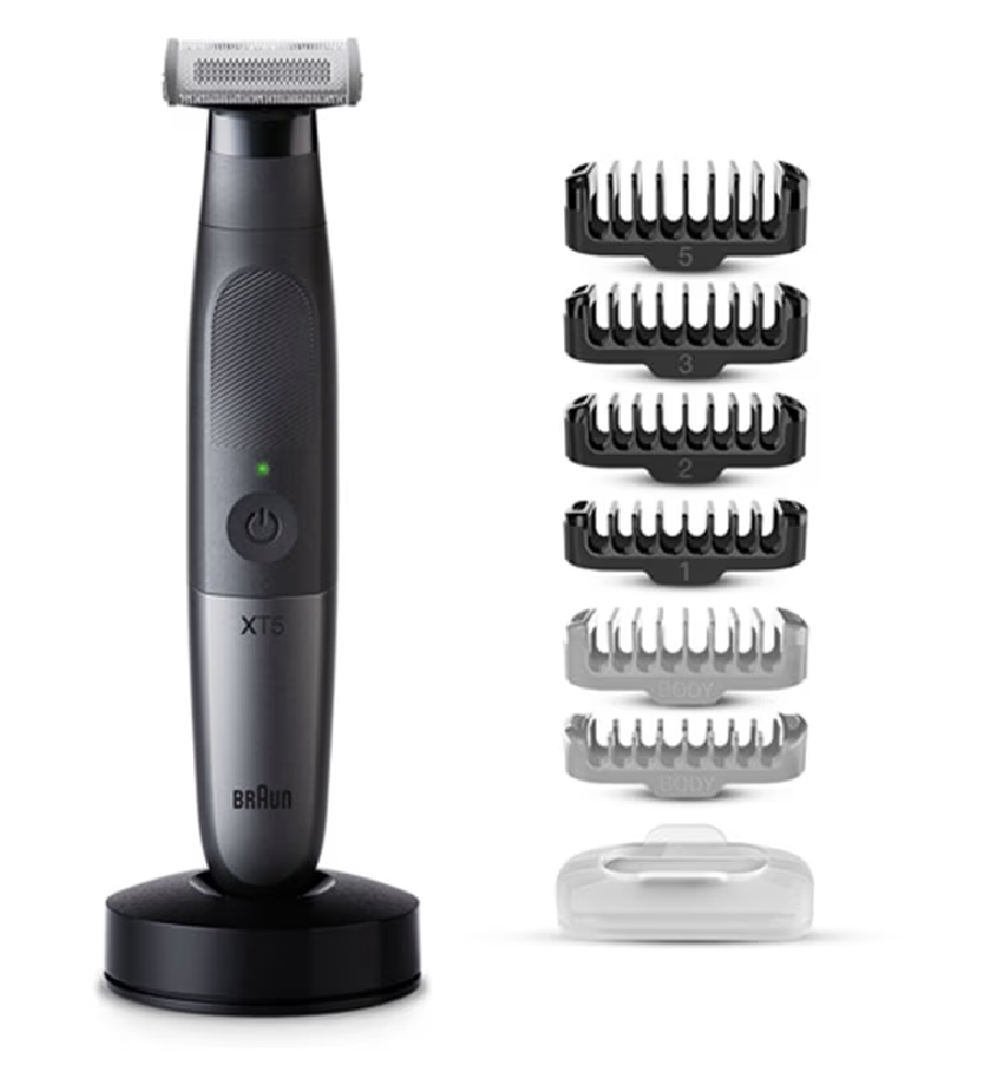 ブラウン「ボディ&フェイスグルーマー PRO X XT5300」 ■顔からボディまでオールインワンでムダ毛処理ができる ・前後に動くヘッドと、どの方向にもトリ...