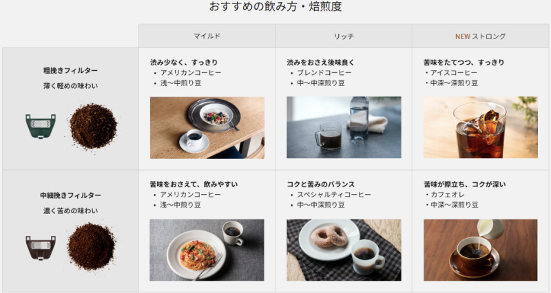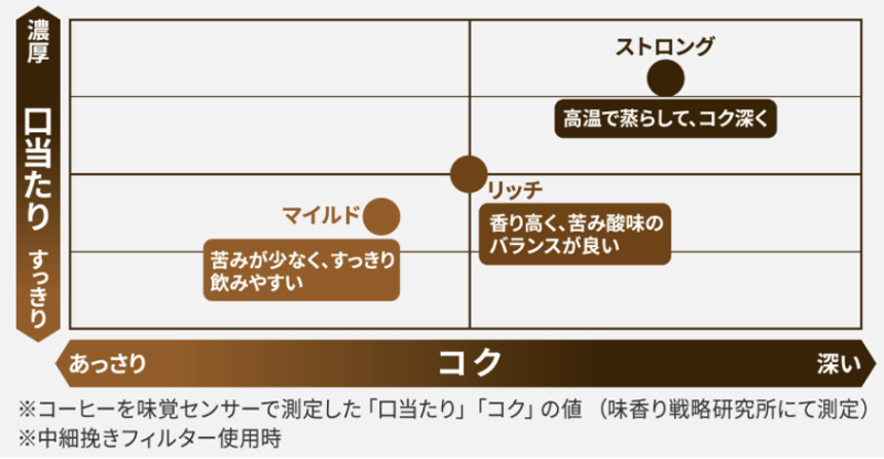 ・全体的なバランスを重視した「リッチ」、苦みが少ない「マイルド」に、渋味を抑えながら苦みとコクを引き出す「ストロング」コースを追加