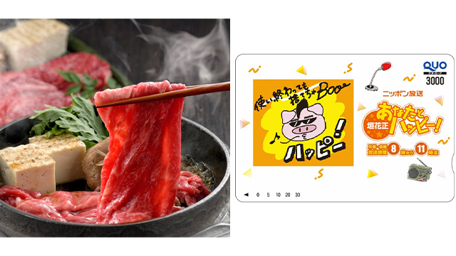 メール・FAXを送っていただいた全ての方の中から、抽選で毎日5名様に松阪牛の切り落とし1キロをプレゼント! さらに、番組オリジナルQUOカード3,000円分を、月曜は16名様、 火曜は17名様、水曜は18名様、木曜は20名様に差し上げます!
