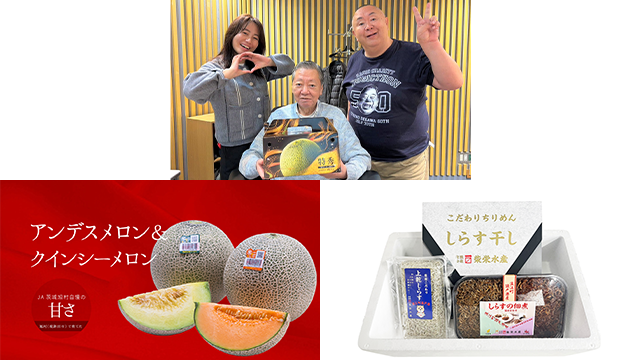 メールかFAXを送っていただいた方の中から抽選で、JA茨城旭村メロン部会から、「特秀」アンデスメロンとクインシーメロンのセットを毎日5名様、計25名様にプレゼントします!また、浪江町請戸港特産、食べくらべちりめんセットも毎日2名様、計10名様にお送りします!