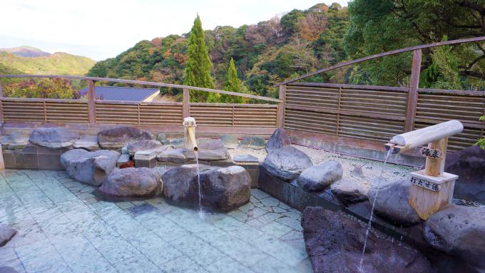 ―(とくに寒い時期ですので)入る時は「かけ湯」をしていただいて、お湯の温度に(体を)慣らして、ヒートショックにならないようにゆっくりと入っていただきたいと思います。さあ、露天風呂にも行ってみましょうか。この露天風呂が本当に素晴らしい!何といっても、男湯よりも眺めがいい(笑)!稲取のほうの山々まで、ずっと見えていますね!