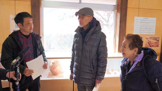 ―2年ぶりに、下田のお隣・南伊豆町の内陸部、青野川(あおのがわ)の畔で始まった「第28回みなみの桜と菜の花まつり」の会場にやってきました。きれいな河津桜の下で桑原さんにお話を伺おうと思ったんですが、(伺った日は)とても風が強くて「道の駅下賀茂温泉湯の花」にありますいろいろな土器が展示された展示館をお借りしています。