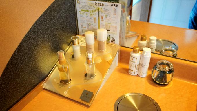 部屋に用意されている観音温泉水を使った化粧品(試供品)
