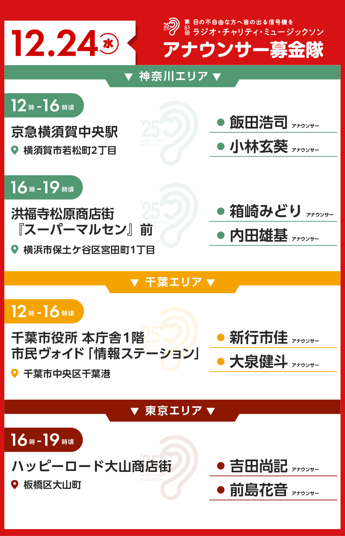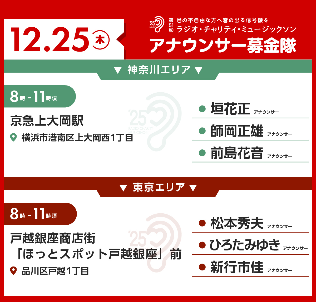 12月24日・25日にお届けする「第51回ラジオ・チャリティ・ミュージックソン」24時間特別番組の中で、「アナウンサー募金隊」が街に出て募金活動を行います。