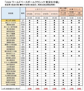 | 3月6日(金) | 日本 – チャイニーズ・タイペイ | 18時30分 | 里崎智也、AKI猪瀬 | 大泉健斗 |